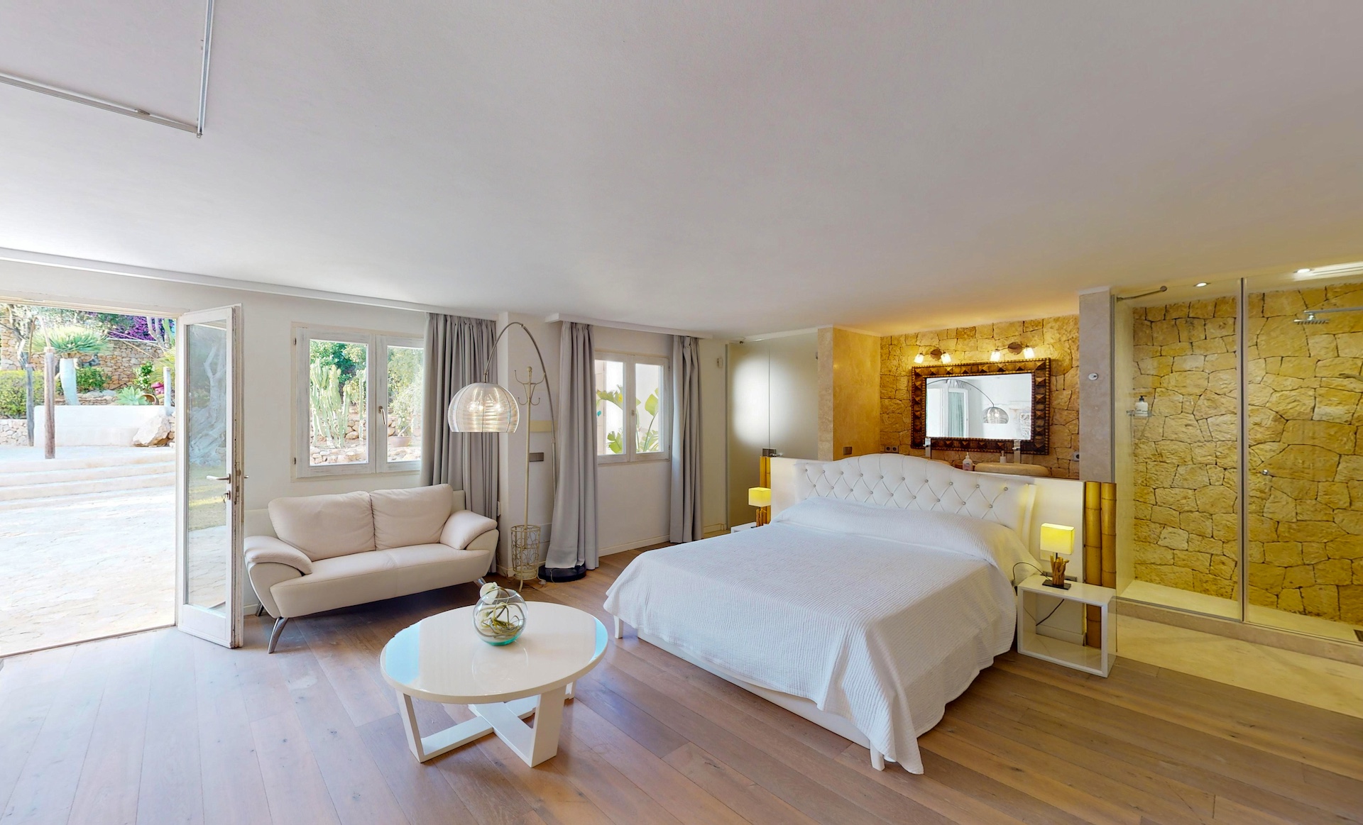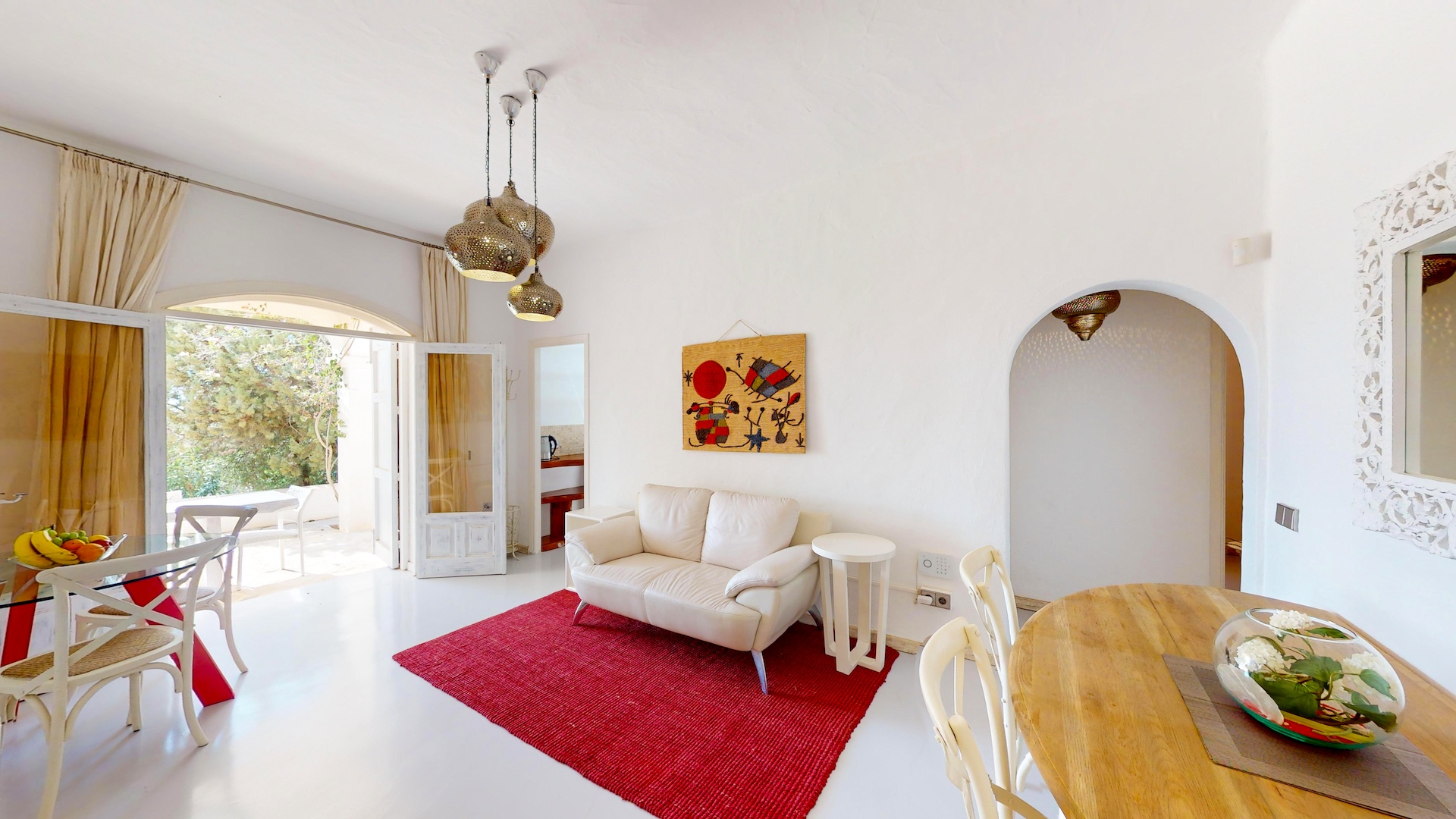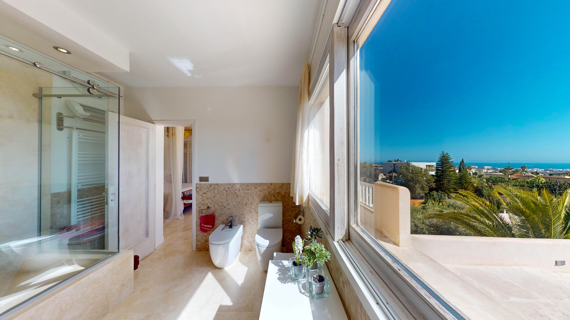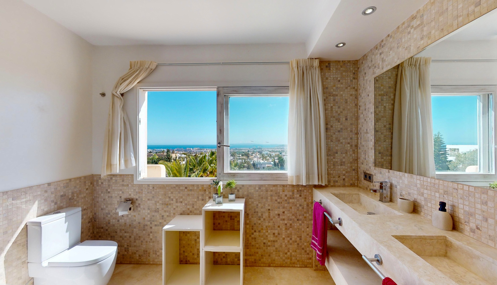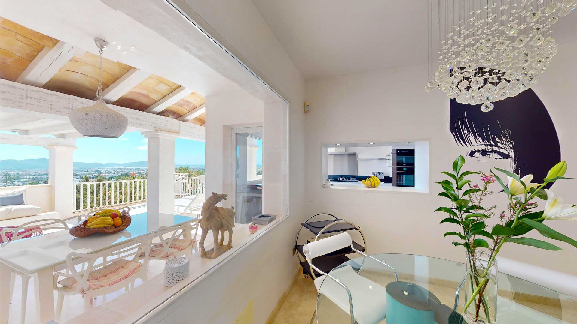 Desde cada ventana de la casa principal se puede disfrutar de impresionantes vistas al mar y a la isla de Formentera. Destaca por su gran luminosidad.