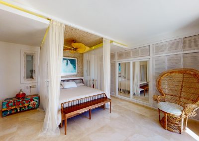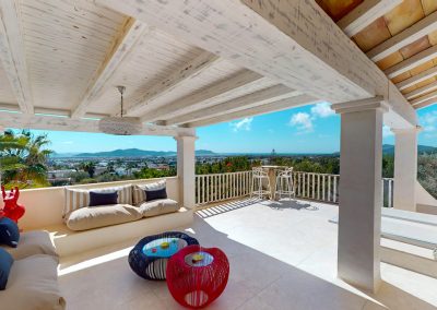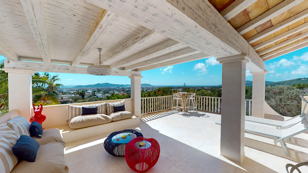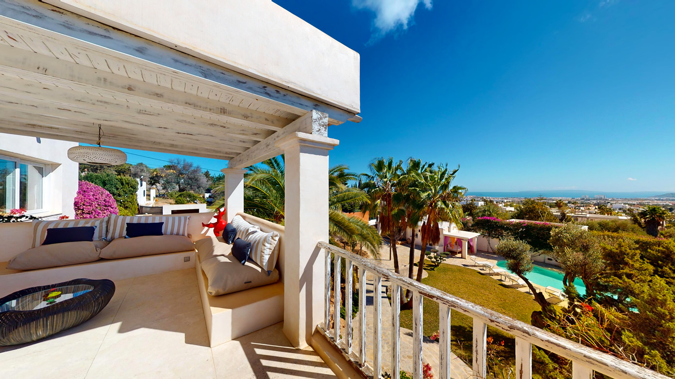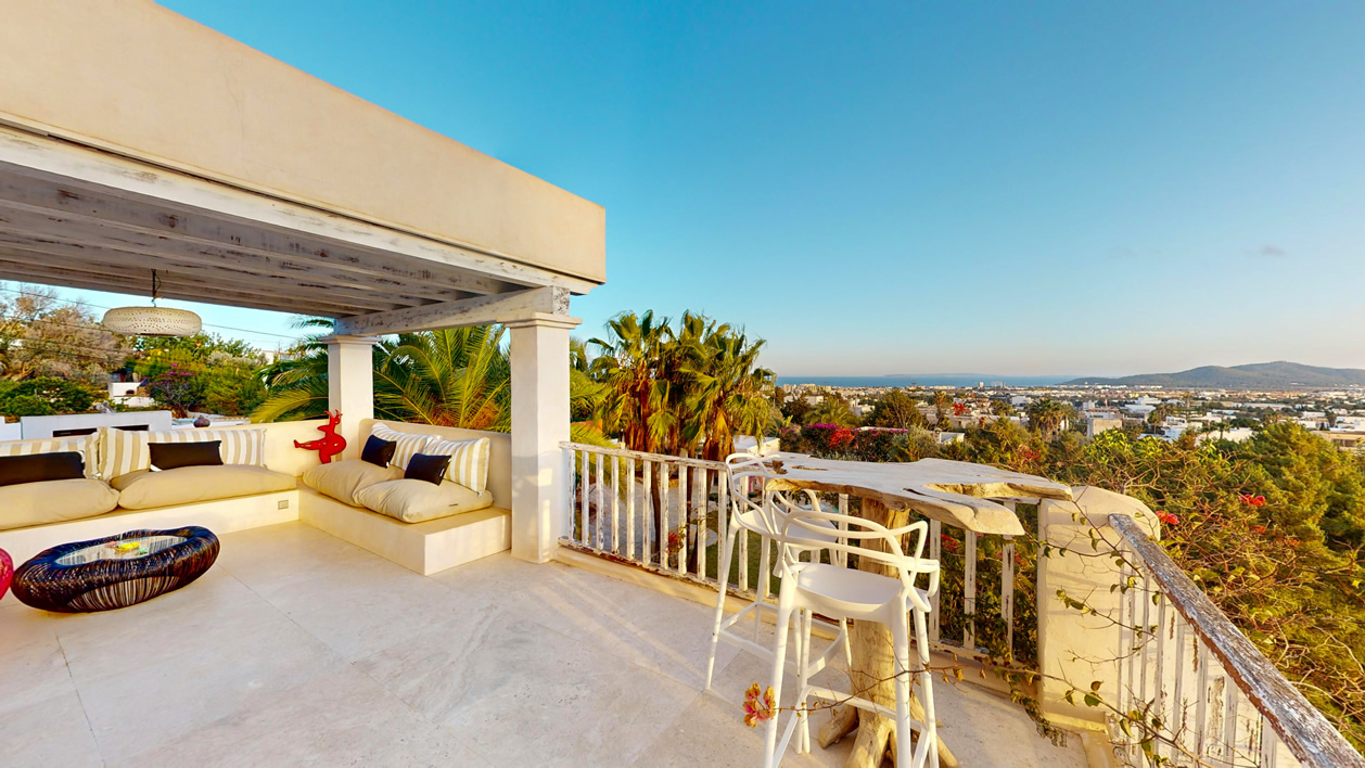 Con un total de 7 habitaciones o diferentes espacios, incluyendo una suite principal en la parte superior, un balcón con vistas a Formentera y 2 vestidores o habitaciones. En el nivel principal se encuentra una cocina totalmente equipada, una gran sala de estar ideal para compartir momentos en grupo, así como en su terraza con vistas directas al mar y a toda la ciudad de Ibiza.